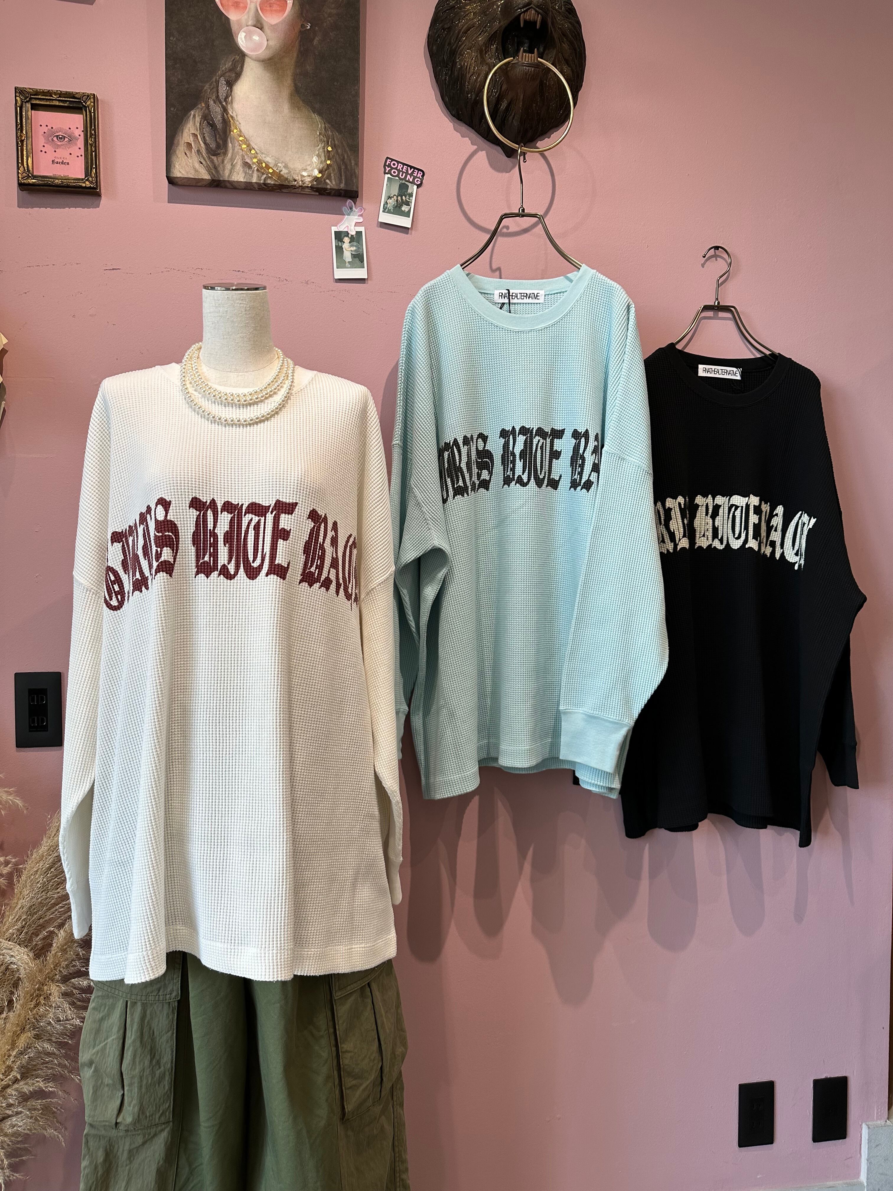 フロントの「GIRLS BITE BACK」を直訳すると「女の子の反撃」という意味です。