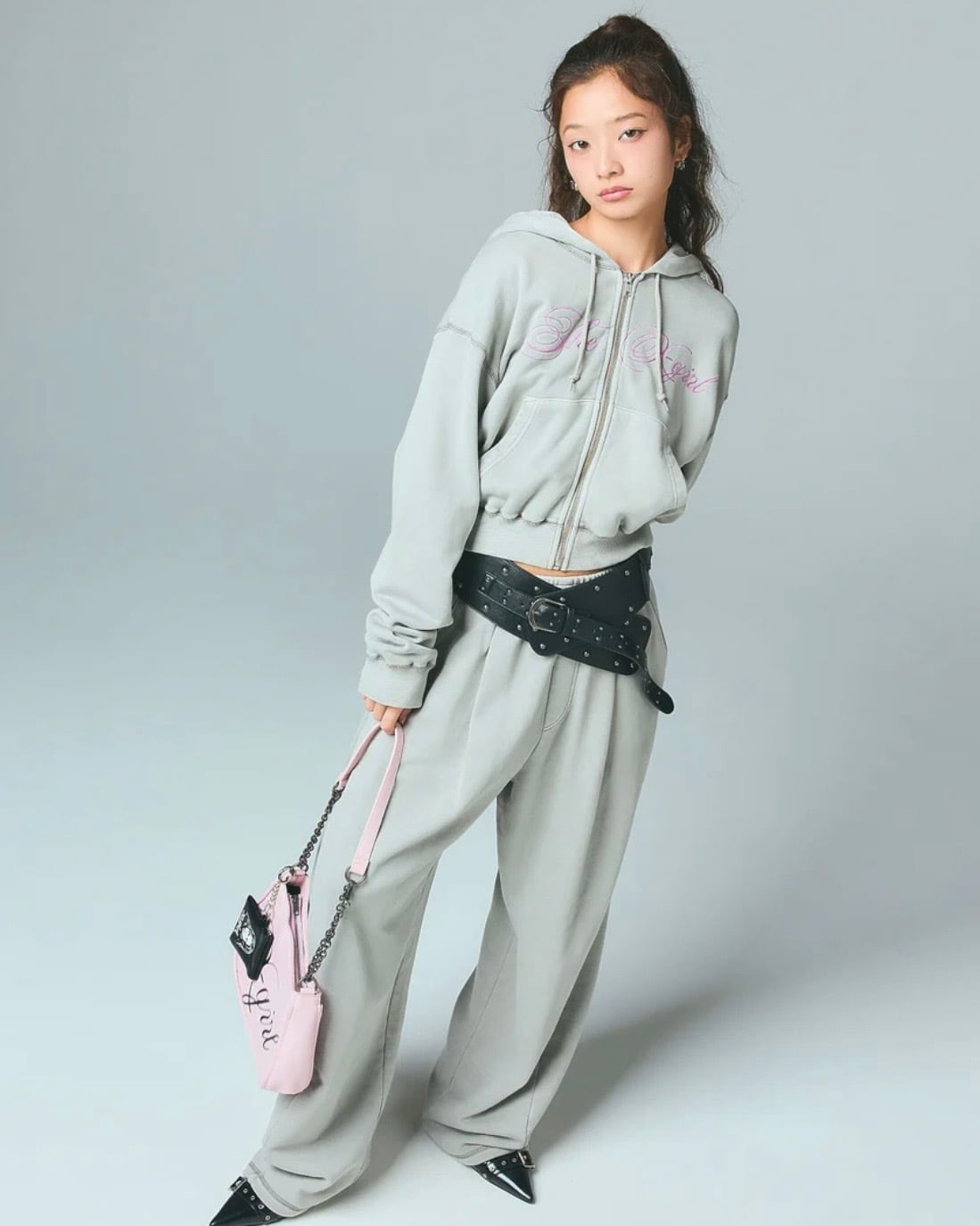 ルーズシルエットのスウェットパンツには、ちびTやコンパクトなトップスが相性抜群。